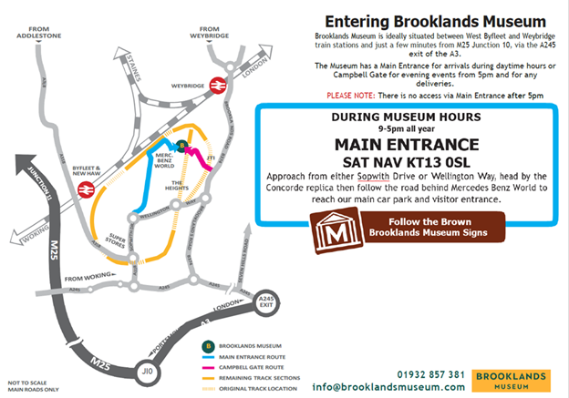 From either Sopwith Drive or Wellington Way, exit the roundabout to Concorde replica (blue arrow in map attached) and towards Mercedes Benz World. Follow the road behind Mercedes Benz World to reach the main car park (free) and visitor entrance.