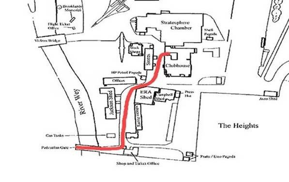 Enter the Brooklands Museum building via. Pedestrian Gate. Walk down and turn left at the shop and ticket office (following red marking in map).